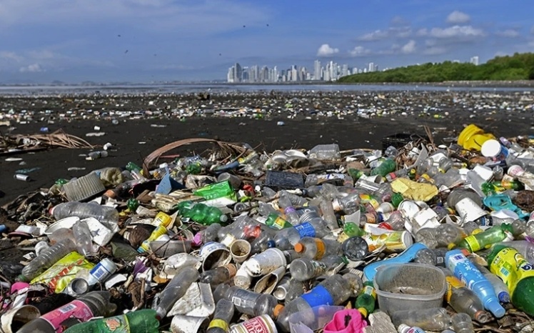图4:2021年4月19日,在巴拿马城埃斯特海岸的海滩上,可以看到许多包括塑料在内的垃圾